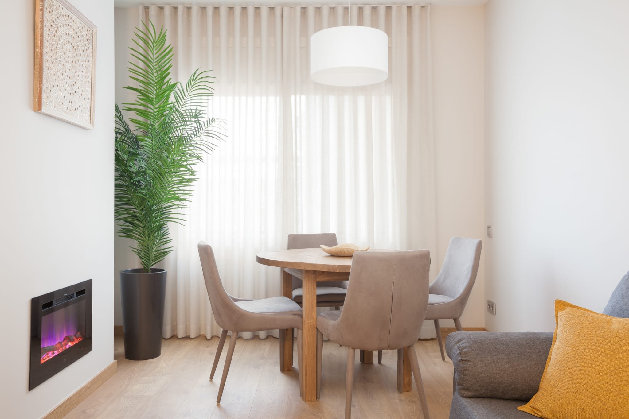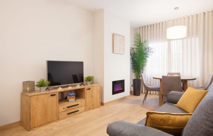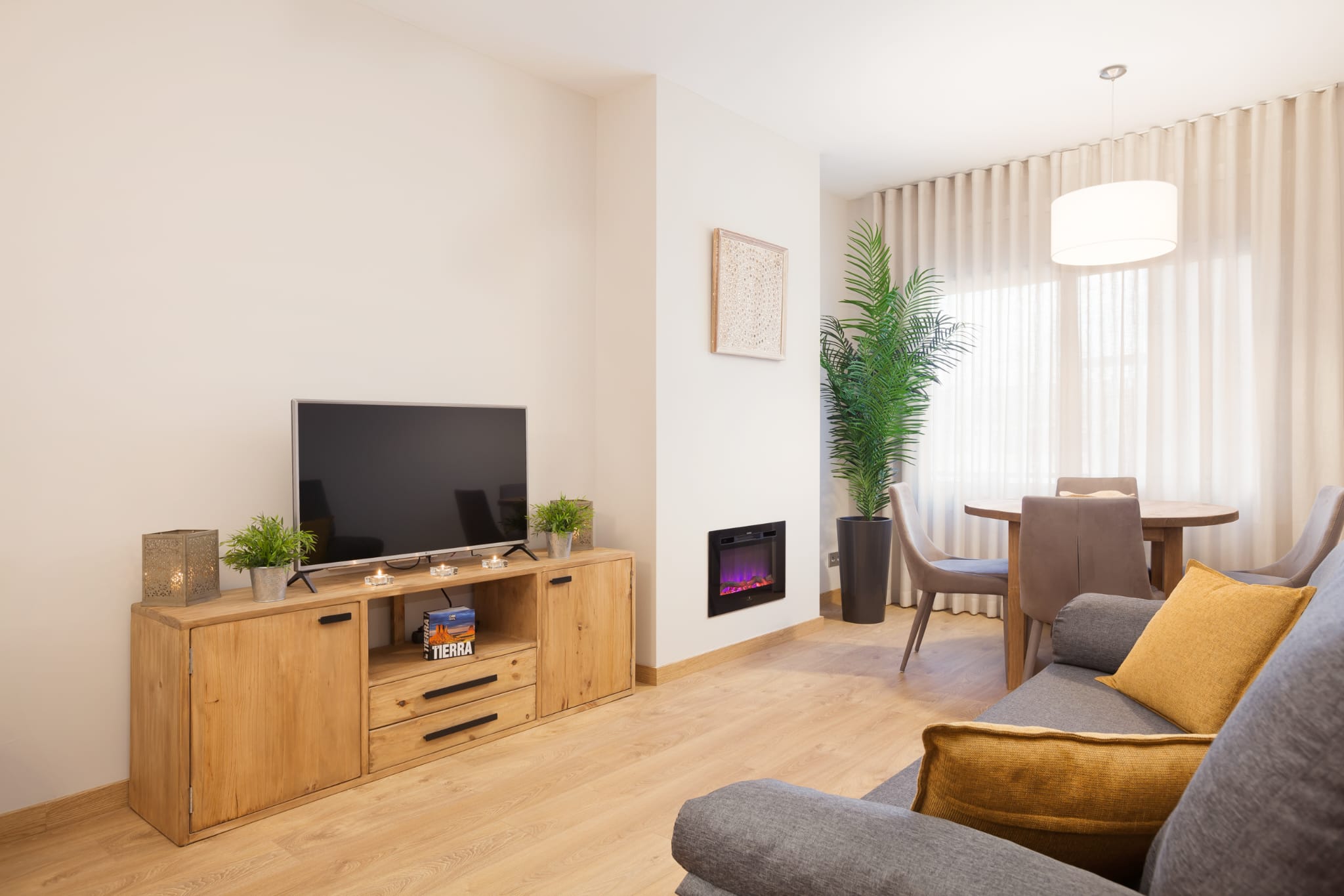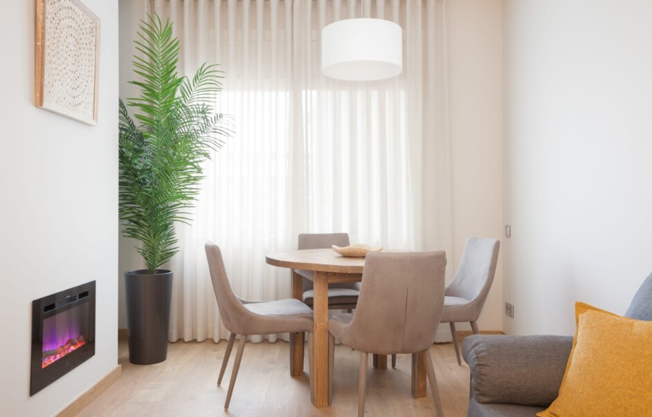 SALÓN-COMEDOR EXTERIOR AMPLIO CON GRAN VENTANAL Y CHIMENEA ELÉCTRICA.